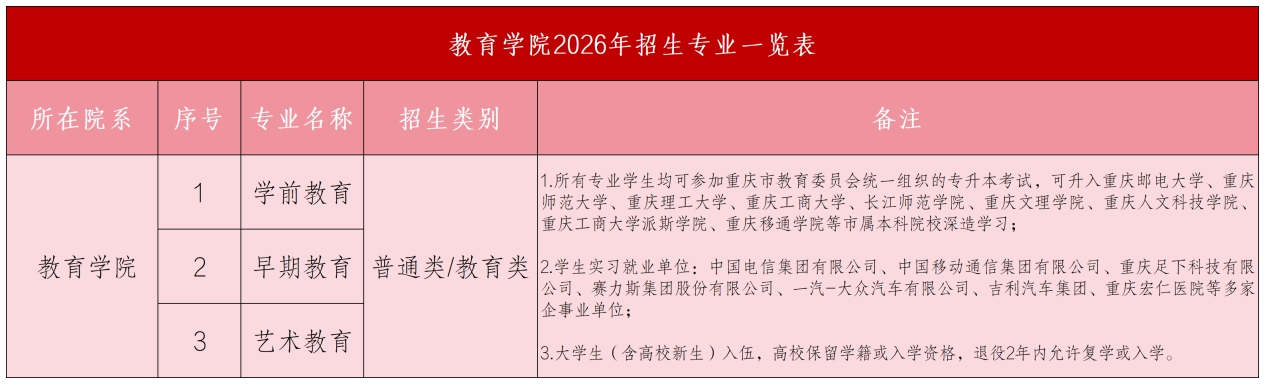教育学院通过数量众多的优质校外实习实训基地构建了“产教结合、校企合作、工学交替”的人才培养模式。建有以校内专任教师为核心,校外行业企业骨干兼职、兼课教师为补充的优秀教师团队。师生历年在各级各类专业领域竞赛中屡获佳绩。专业设立以来累计为重庆及周边省市输送合格师范生近4000余名。
