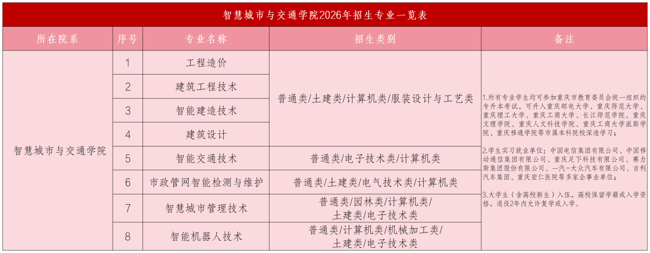 智慧城市与交通学院是契合数字经济与新型城镇化发展的高技能人才培养高地,紧密对接国家 “十五五” 规划相关战略及重庆市 “智慧名城”“交通强市”发展目标。学院开设智慧城市管理技术、智能交通技术、智能建造技术等多个专业,构建以“智慧规划、智能交通、数字市政”为核心,贯穿城市与交通基础设施全生命周期的“数字技术 + 城市交通”专业群体系。
