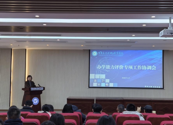 为扎实推进学校办学能力评价工作,确保各项任务有序开展,学校于2026年1月15日上午9时,在图书馆综合楼宣讲室召开办学能力评价专项工作协调会。全体校领导,各职能部门、教学单位负责人,副科级以上干部、各专业带头人、教研室主任及协同育人单位代表参加,会议由校长薛峰主持。